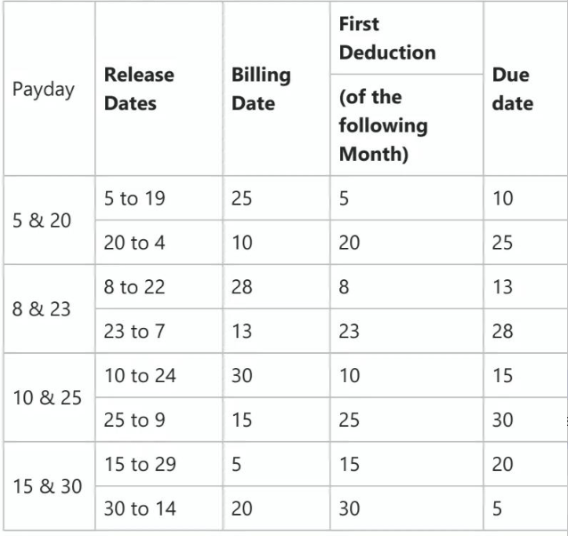 First Due Date – First date of deduction from the Lender (see below Billing and Due Date Schedule)